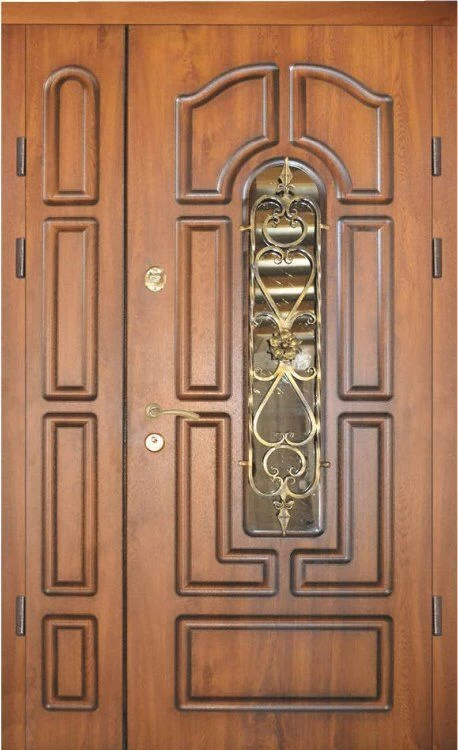 Поскольку в большинстве случаев устанавливаемые на входе в коттедж двустворчатые двери являются еще и предметом интерьера, украшающим здание, их дизайну предается особое значение. Эти двери, как правило, отделываются атмосферостойким МДФ, натуральным шпоном, массивом. Эффектно на таких дверях смотрится витражный узор, применение ковки, зеркальных элементов. Вариантов декора входной двустворчатой двери масса, тут все зависит от пожеланий заказчика.